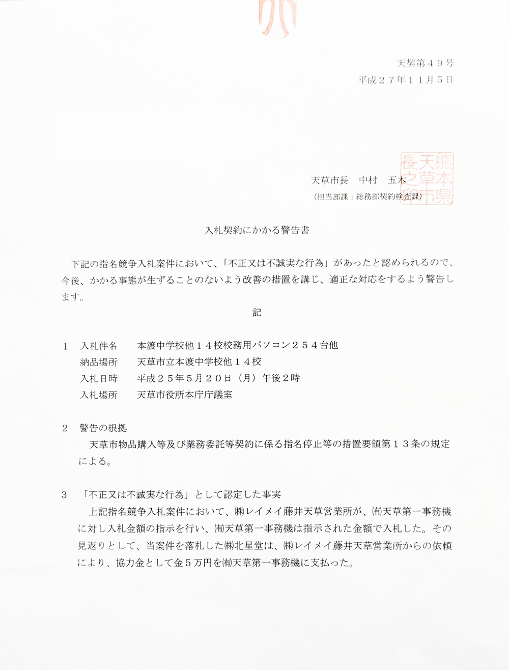 下の警告書ですが会社名が3社しかありませんが他にダイワ、フジコー、そのほかに参加しているのに市役所側で調整しているのです、3社で談合できませんよ、レイメイ藤井の福井社員が話はついているからと協力してくれと迫る(脅す)のです、商品の物流を卸業者に操作されれば小売店は困るのです。このようにして天草市役所の物品購入を独占ているのです、その裏に犯罪があるのです。